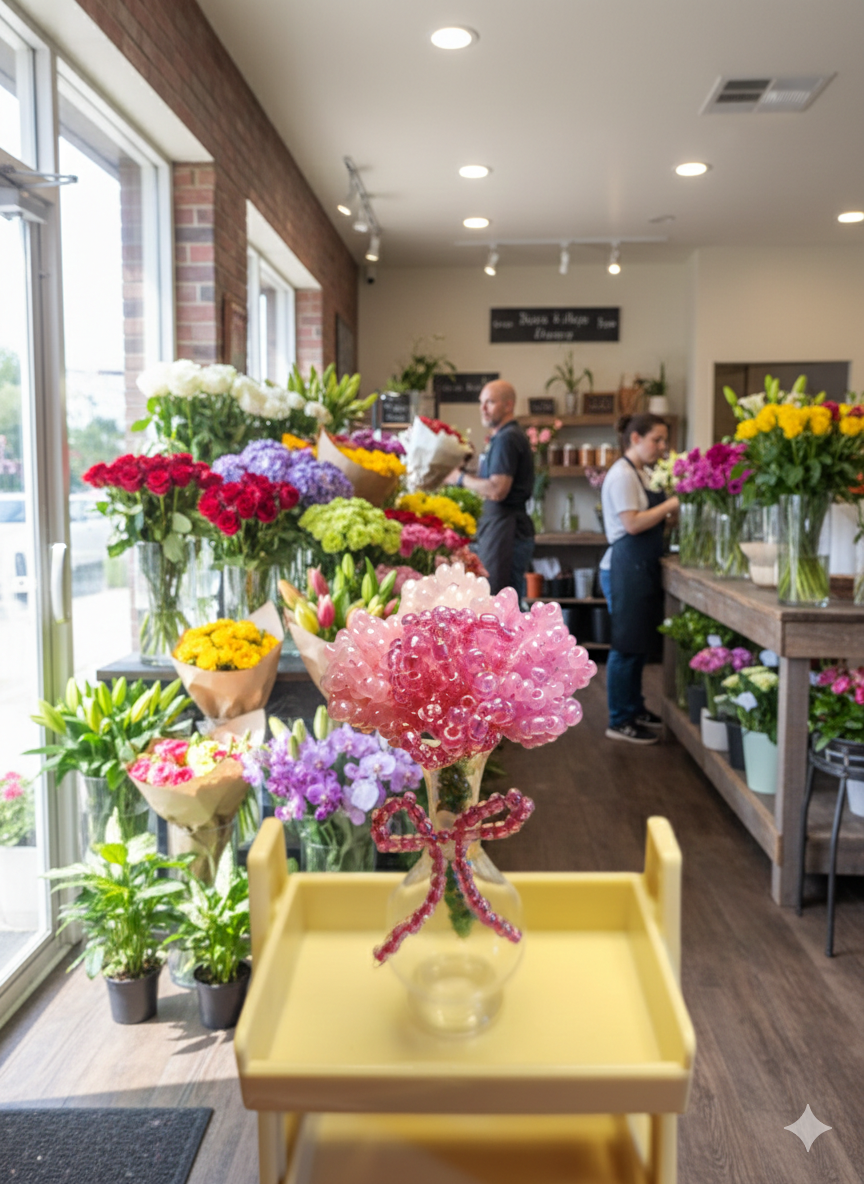 Features beads and wire formed into a tiny bouquet. Keep this and all beaded items away from children and pets due to chocking hazards.