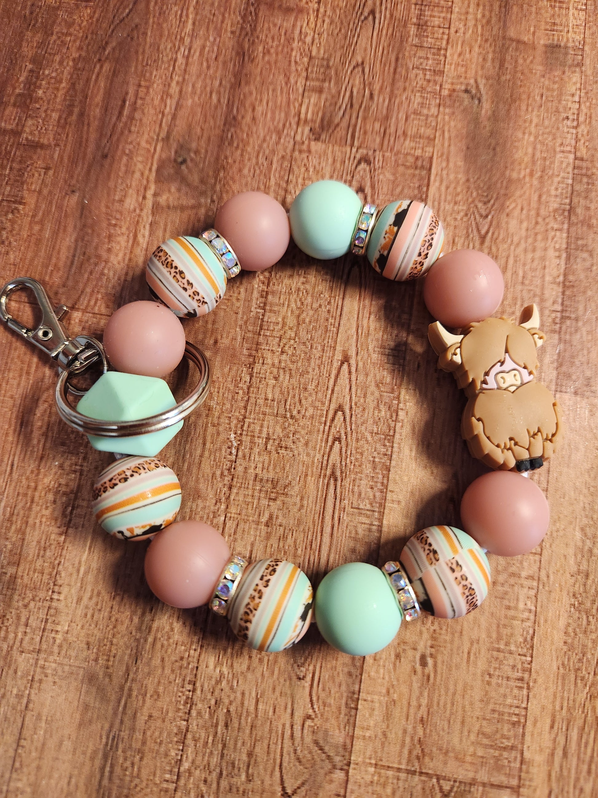Features silicone beads on 2mm stretch cord with a silver keychain. Fits wrist size 6.5-8 inches comfortably. Keep this and all beaded items away from children and pets due to chocking hazards.
