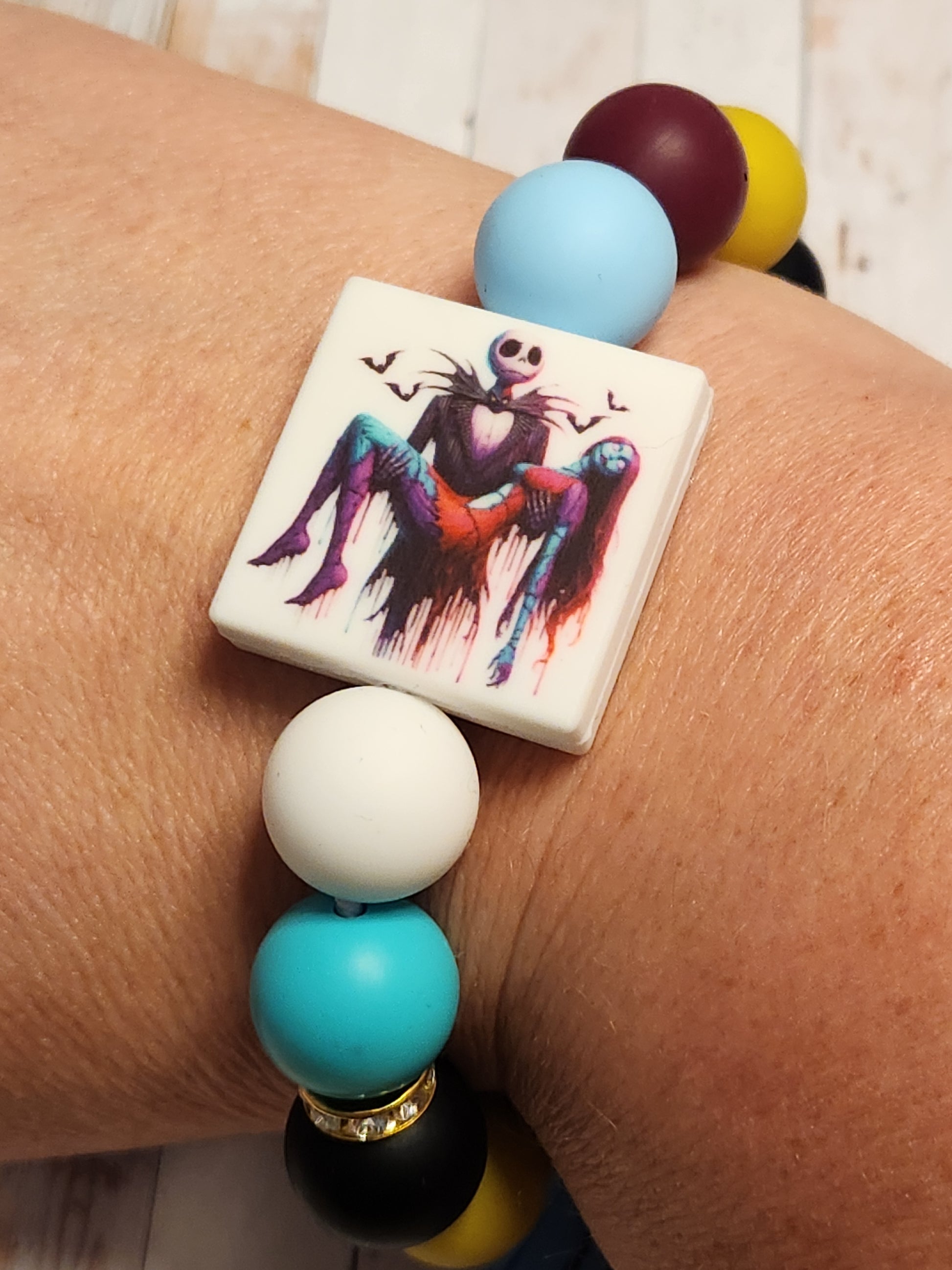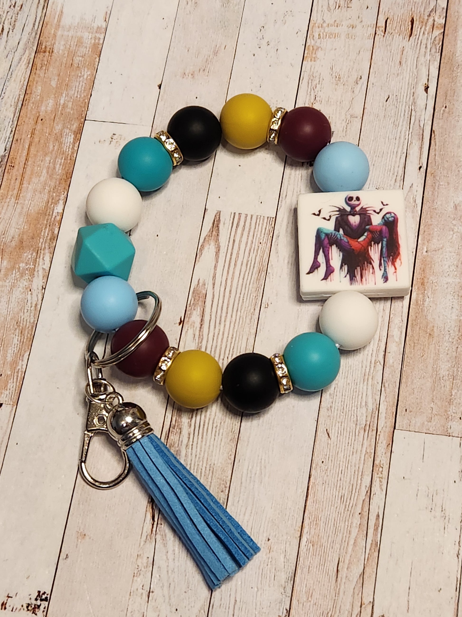 Features silicone beads on 2mm stretch cord with a silver keychain. Fits wrist size 6.5-8 inches comfortably. Keep this and all beaded items away from children and pets due to chocking hazards.
